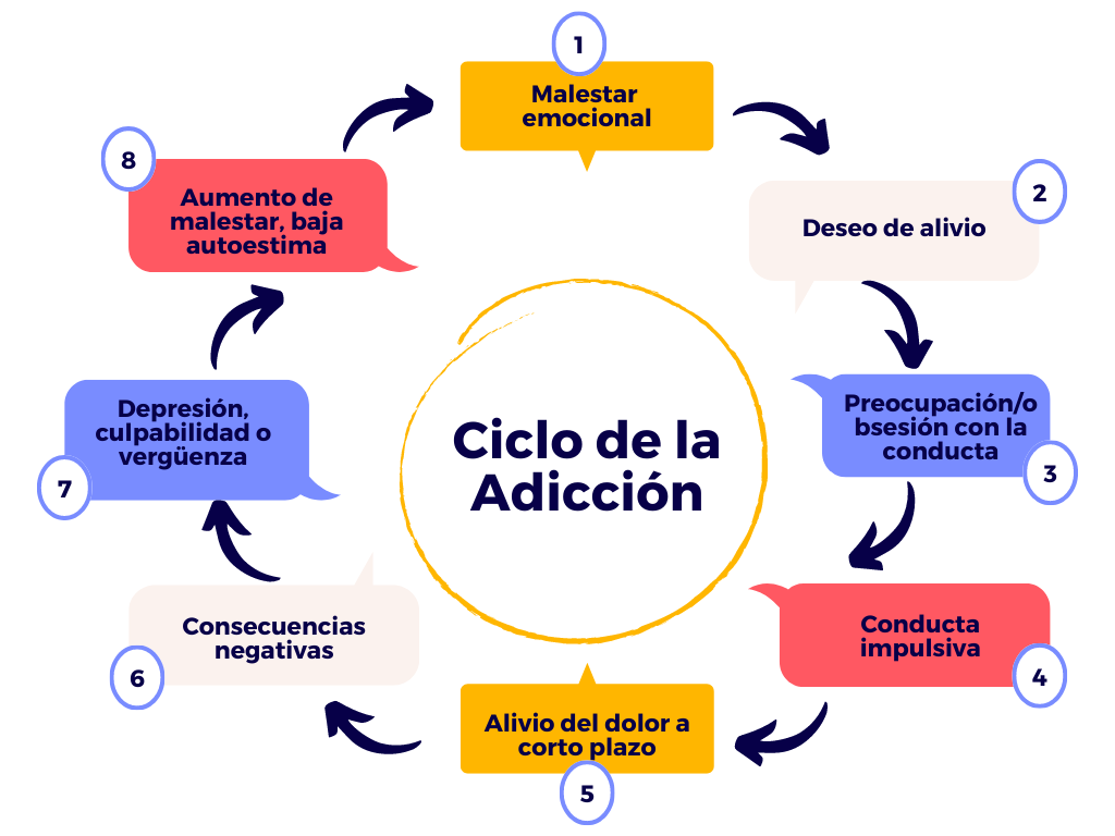 Por otra parte, la persona que tiene problemas de adicción suele caer en un ciclo de dependencia, donde el deseo por consumir la sustancia o realizar la conducta adictiva es tan fuerte que dificulta su control y afecta negativamente su vida personal, social y laboral.